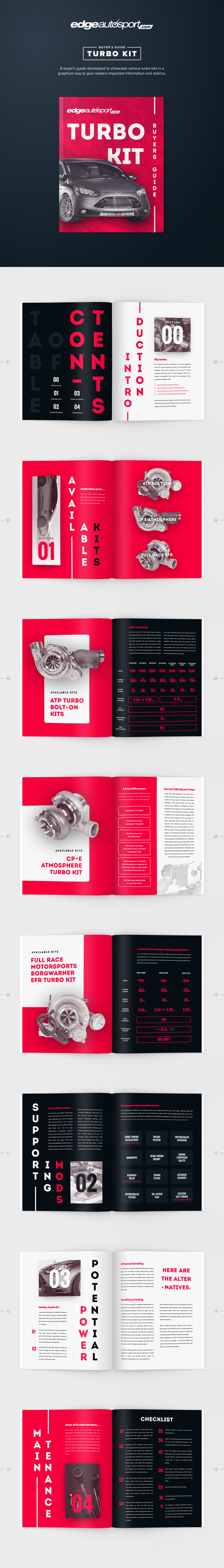 A buyer's guide developed for Edge Autosport to showcase various turbo kits in a graphical way that gives readers important information and metrics.